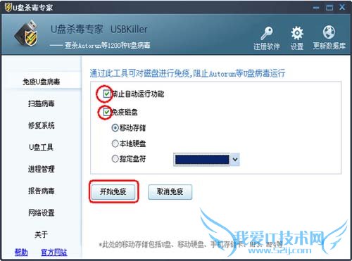 2、在项目栏上单击“免疫U盘病毒”选项。选中“禁止自动运行功能”和“免疫磁盘”,根据需要进行磁盘的选择,单击“开始免疫”,既可做到U盘病毒的免疫作用。