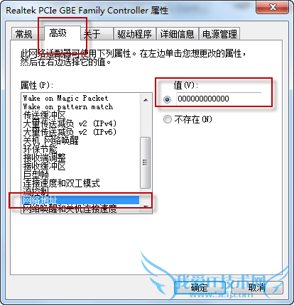 接着打开高级选项卡,找到网络地址选项,填入自定义的MAC地址,保存即可。