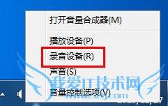 1. 在任务栏右下角下喇叭图标上点击右键选择“录音设备”;
