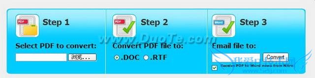 1.访问http://www.pdftoword.com/:①上传pdf→②选定格式(doc/rtf)→③输入接收邮箱。