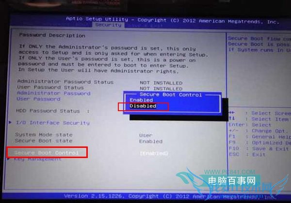 1,按笔记本电源键,然后不停地按F2键,进入到BIOS操作界面.在键盘上面选择其方向右键在Security(中文意思安全,安全的)选项下找到Secure BOOT Control,将Enabled改为Disabled,这一步骤的目的是关闭微软的Secure BOOT,这个功能开启会导致不能识别U盘启动系统的安装。