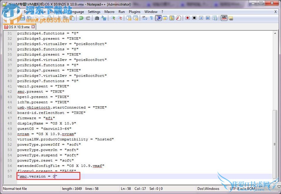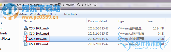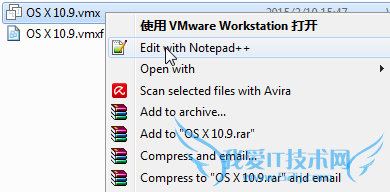 2.右击。vmx文件(名字也是自己设置的,我这个设置是OS X 10.9.vmx),使用记事本(或者Notepad++都是一样的)打开文件。