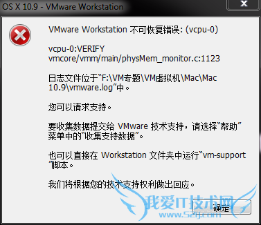 “VMware Workstation不可恢复错误:(vcpu-0)vcpu-0:VEREIFY vmcore/vmm/main/physMem_monitor.c.1123日志文件位于”E:OS X\vmware.log“中。你可以请求支持。要收集数据提供过给VMware技术支持,请选择”帮助“菜单中的”收集支持数据“。也可以直接在VMwarestation文件夹中运行”vm-support“脚本。我们将根据您的技术支持权利做出回应。”
