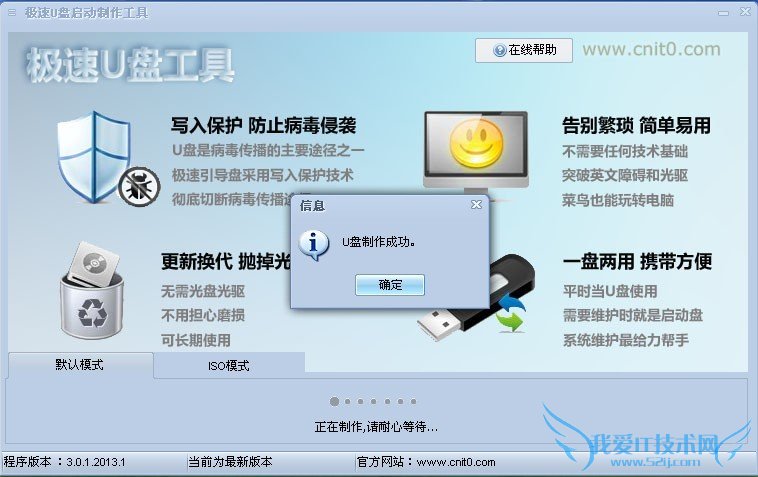 制作过程中不要进行其它操作以免造成制作失败,制作过程中可能会出现短时间的停顿,请耐心等待几秒钟,当提示制作完成时安全删除您的U盘并重新插拔U盘即可完成启动U盘的制作。