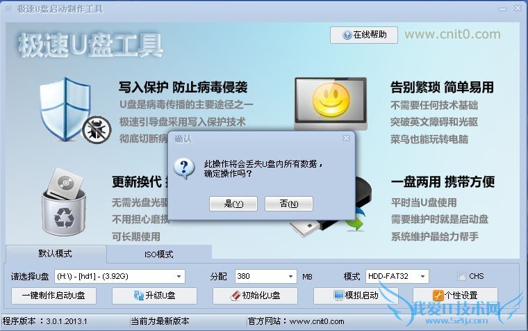 按钮,程序会提示是否继续,确认所选U盘无重要数据后开始制作: