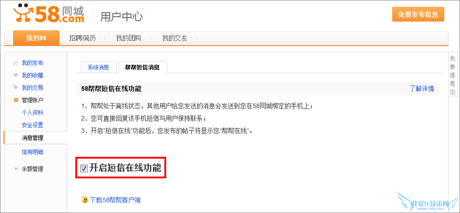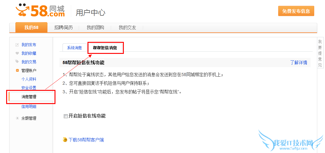 2. 通过58同城用户中心的“帮帮短息消息”页面开启或关闭此功能:
