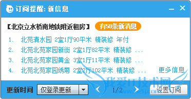如果您使用58帮帮客户端,那么客户端会根据您设置的更新时间,为您检索一次您的“订阅条件”,如果您的“订阅条件”有更新的内容,58帮帮客户端将弹出窗口提示您更新;