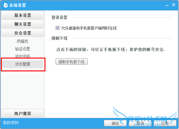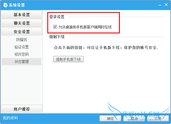 第二步:勾选【允许桌面和手机版客户端同时在线】前的复选框(系统默认设置为已经勾选),然后点击【确定】或【应用】完成设置;