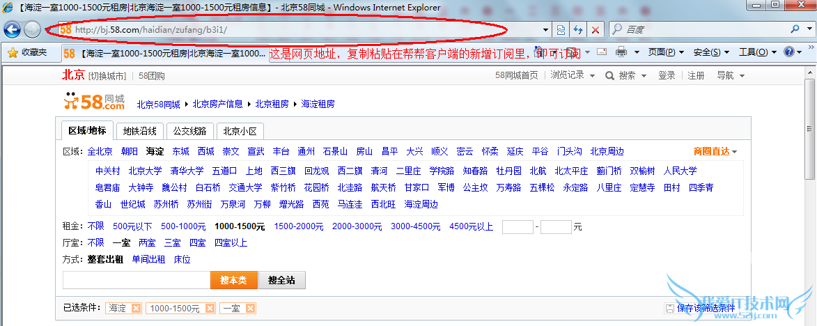 (增加新的订阅条件,需要现在58同城网站列表页筛选信息,比如选择“租房”“海淀”“一居室”,然后将网页的地址复制、粘贴在输入框里,最后点击“添加”按钮,即可增加一条订阅)