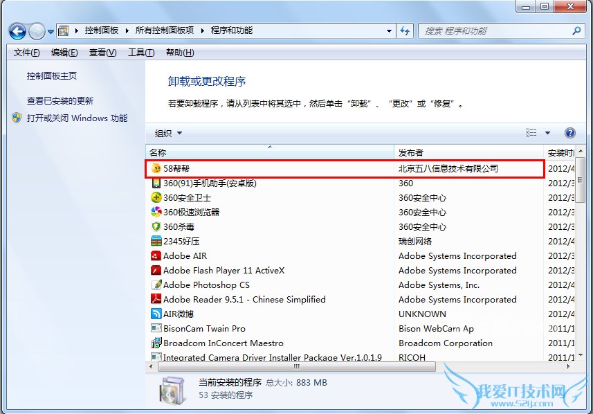 ② 点击进入“程序和功能”界面后找到“58帮帮”程序