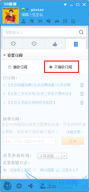 在58帮帮客户端主面板点击“订阅”按钮,打开订阅设置界面,选择“不接受订阅”,然后保存,即可完成设置。不再接受订阅信息。