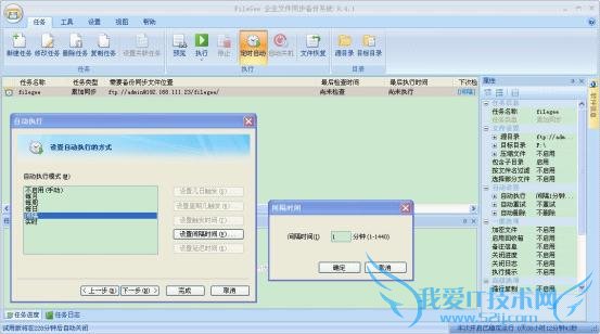 ftp任务的目录已建立,下面在建立同步策略,同步方式多种:实时、间隔、每天等等。以‘间隔’为例,设置ftp文件自动同步任务。在建立任务的向导之‘自动执行’对话框中,选择‘间隔 ’,设置间隔时间为‘1’分钟。如下图: