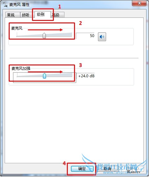 3、选择“级别”选项卡,将其中的“麦克风”音量调低到合适,将“麦克风加强”调到合适低,然后单击“确定”。如图: