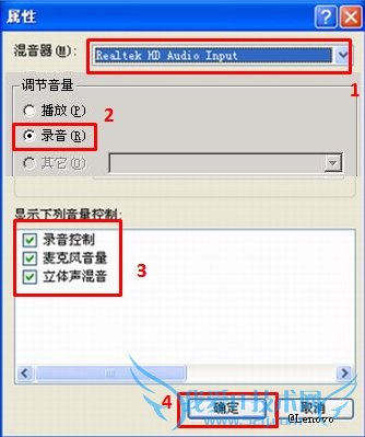 3、如果“调节音量”中的“录音”为灰色不可选,则需要将“混音器”里面的选项选择为“……Audio Input”(不同型号的电脑,显示的名称可能会不一样,但后面都是Input)。如图: