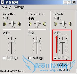 4、返回到“音量控制”界面,找到“麦克风”,拉动滑块调大麦克风的音量到合适即可。如图: