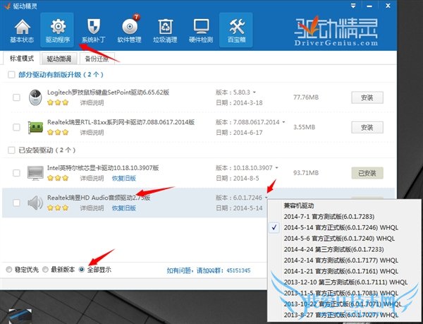 四、用驱动精灵更换不同版本的声卡驱动程序