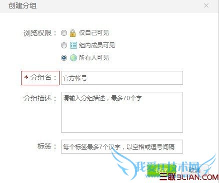 2、输入分组名以及分组权限(自己可见、组内成员可见、所有人可见)