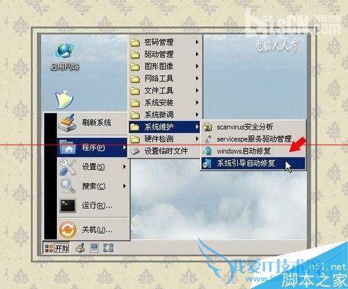 3、好在还能进入u盘PE系统,且这里认硬盘,就好办了。老毛挑→开始→程序→系统维护→系统引导自动修复