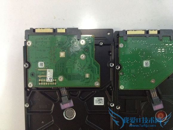 新旧两块硬盘对比,从控制电路板就很明显的区别出来了,左边的硬盘电路板明显的被氧化的变黑的了,右边是全新的控制电路板。