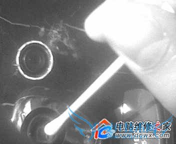笔者注意到,在镜头上面沾有浅浅的水印。再查看摄像头内的芯片,也发现了这种水印。如何清除这些水印呢?笔者考虑后,决定综合采用镜头纸和医用的棉花 签。理由如下:镜头纸是专业的清理这类镜头的,而仅仅用棉花签则可能在清除的过程中在镜头表面遗留下细微的棉花纤维,会影响清洁效果;利用棉花签可以把镜 头纸包在棉花头上,在棉花签“长度”的支持下可方便地对镜头芯片和镜头进行清洁(如图2),这样就不会在清洁后留下“垃圾”。