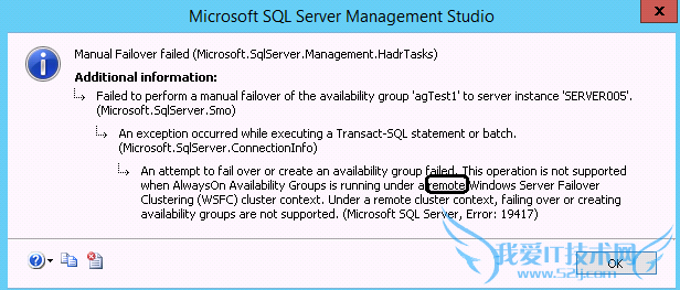 An attempt to fail over or create an availability group failed. This operation is not supported when AlwaysOn Availability Groups is running under a remote Windows Server Failover Clustering (WSFC) cluster context. Under a remote cluster context, failing over or creating availability groups are not supported.