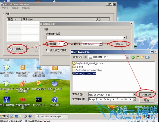 双击 VDM虚拟光驱,在弹出的窗口中选择“装载”,(PS:分配盘符随便选择一个就行,只要不与现有盘符冲突即可,鄙人习惯选择 Z 盘,这样就不会有冲突了),之后单击“浏览”,选择先前准备好的XP光盘镜像文件