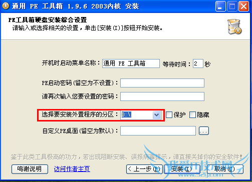 安装模式选择“安装到硬盘”,外置程序要设置到非系统分区(就是你不想格掉的那种分区),这里以D盘为例