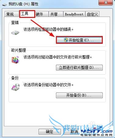 2、在弹出的U盘属性窗口中,选择“工具”标签,再点击“开始检查”按钮。