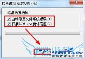 3、然后勾选“自动修复文件系统错误”和“扫描并尝试恢复坏扇区”两项,点击“开始”按钮,进行U盘修复。