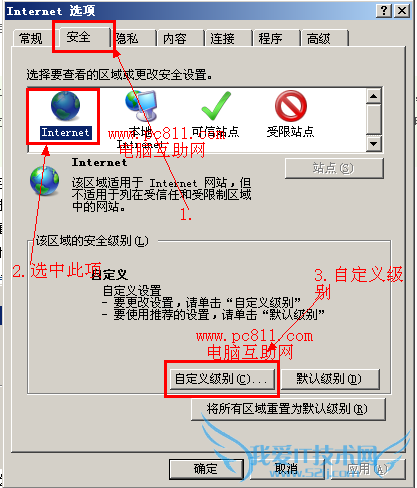 第2步:在打开的“Internet选项”窗口中,单击“安全”选项卡,并选中“Internet”项,然后单击“自定义级别”按扭。