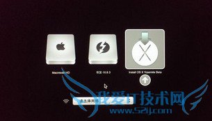 已经制作成功的安装U盘,怎么使用呢?你需要重新开机,开机之后一直摁住option直到下图所示界面出现,然后选安装U盘Install OS X Yosemite Beta即可开始安装:
