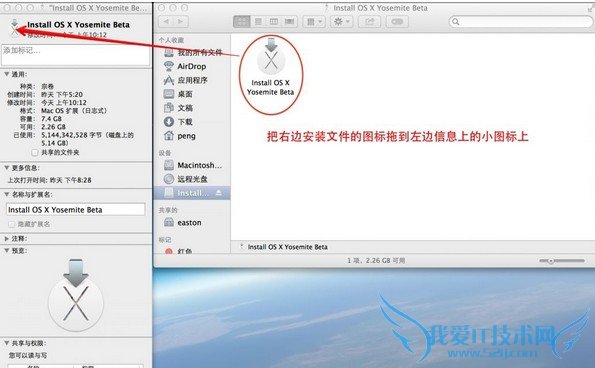 最后,制作完成之后,你还可以小小的美化一下你的作品。双击打开桌面上的Install OS X Yosemite Beta安装U盘,再用右键点击桌面上的Install OS X Yosemite Beta安装U盘,点击“显示简介”,把安装U盘中的文件图标拖到简介信息上部的小图标上: