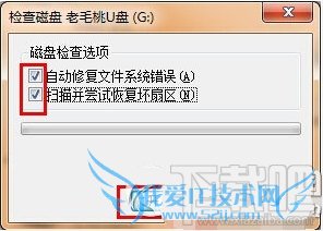 2.接着点击“开始检查”— 勾选“自动修复文件系统错误(A)”、“扫描并尝试恢复坏扇区(N)”——然后点“开始(S)”就可以了。如下面图示: