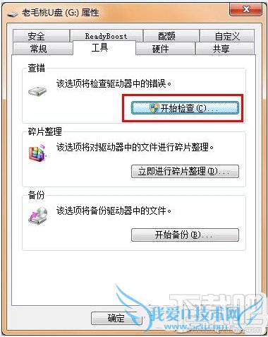 1.把u盘插入电脑的usb接口处,依次打开“我的电脑 — U盘盘符 — 右键选择“属性”—“工具”选项卡 ”,如下图所示: