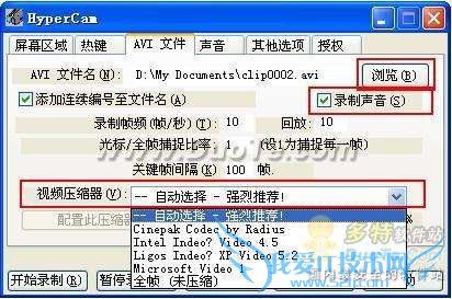 接着设置文件的输出路径,点击“AVI文件”选项卡,点击“浏览”按钮选择视频文件的输出目录;如果需要录制声音,记得勾选录制声音选项哦,然后选择视频压缩器。如图6所示。