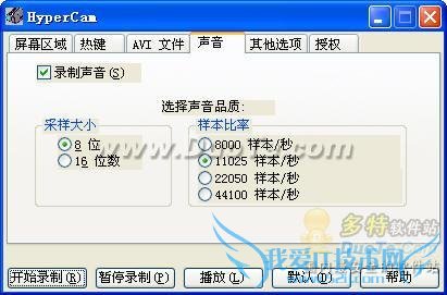 也可以点击“声音”选项卡,勾选录制声音选项。只要勾选一个,两个就会被同时勾选。然后选择采样大小,声音品质。如图7所示。