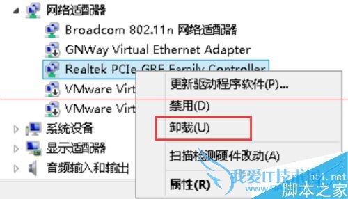 4、对着网卡点击鼠标右键将其卸载,并重新启动计算机后系统会自动安装一遍网卡驱动程序