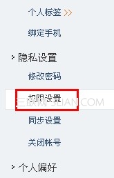 2、在左边的选择“隐私设置”下方,选择“权限设置”,如图: