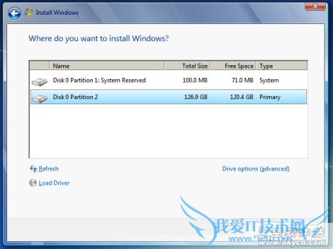 1、从Windows DVD启动,按照提示选择“Custom (Advanced) Installation”,然后单击Next到下一屏(在你PC上使用的硬盘会有所不同,但方法是一样的):