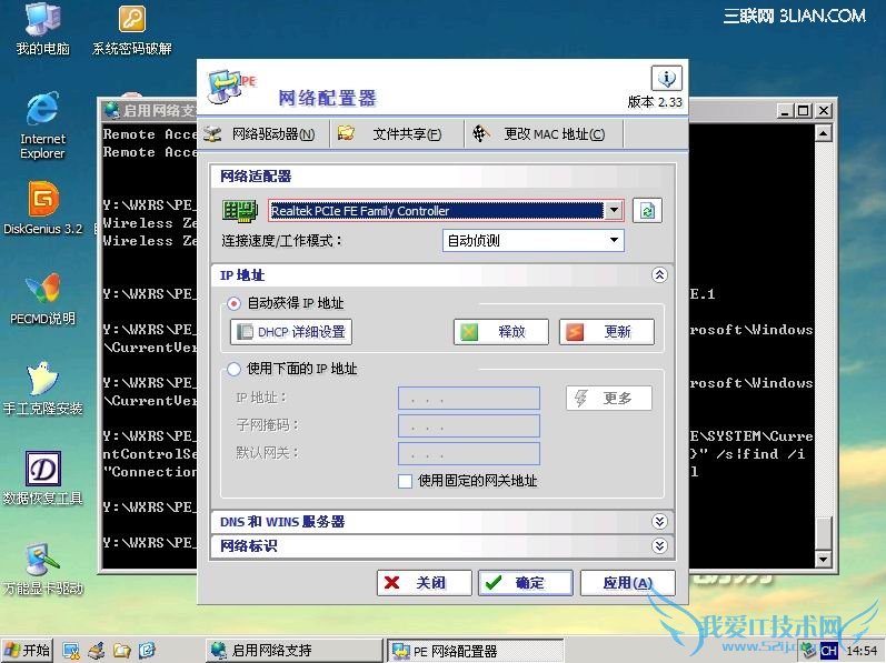进入程序后,将会弹出“PE网络配置器”,选择适配器,点击“应用”,完成后点击“关闭”