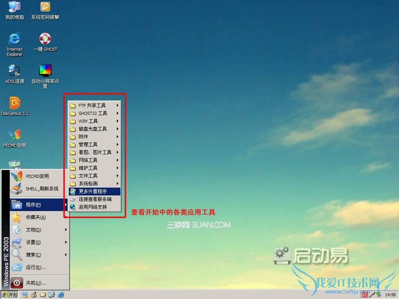 点击“开始”,选择“程序”,查看各类应用,例如:磁盘光盘工具包含(磁盘分区管理、光盘映像工具等),文件工具包含(文件解压WinRAR V3.9),系统检测,GHOST32工具,一键GHOST,DiskGenius 3.2分区工具,万能显卡驱动,数据恢复工具,系统密码破解等各种工具。