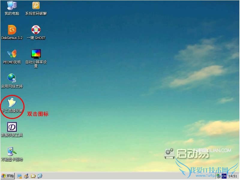 双击“手工克隆安装”,此程序是重装系统工具,按提示操作(如上图)