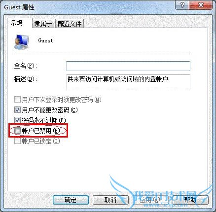 双击【Guest】,打开【Guest属性】窗口,确保【账户已禁用】选项没有被勾选。