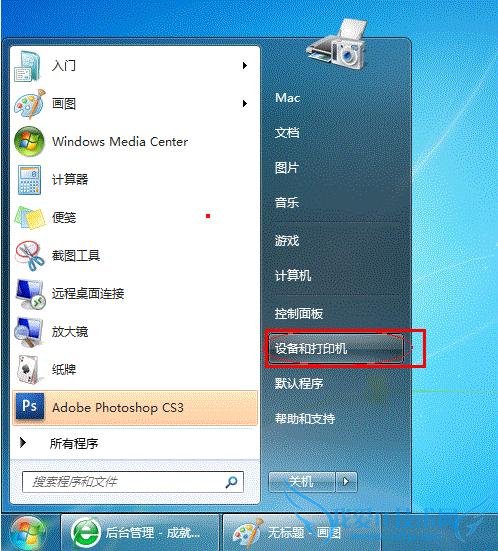 设置共享目标打印机:点击【开始】按钮,选择【设备和打印机】,如下图: