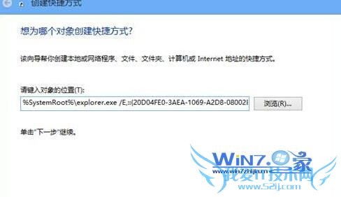 2、然后在键入对象的位置的框中输入%SystemRoot%explorer.exe /e,::{20D04FE0-3AEA-1069-A2D8-08002B30309D},然后点击下一步;