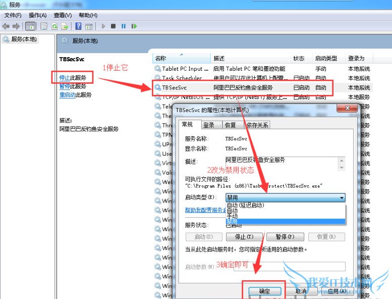 方法一:打开控制面板——【管理工具】——【服务】,找到“TBSecSvc"服务,更改它的属性,选为:停止,并设置【禁用】,然后确定,如下图