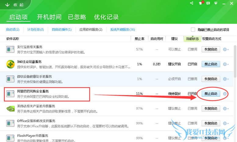 方法二:如果您安装了360安全卫士,还可以在【优化加速】——【启动项】——【应用服务管理】,找到【阿里巴巴网购安全服务】,禁止它就可以了