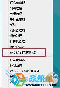 1、我们先打开win8系统的命令提示符窗口,打开方法为WIN键+X 并选择点击“命令提示符(管理员)”如下图;