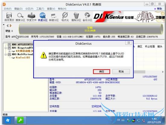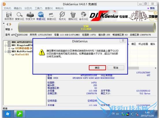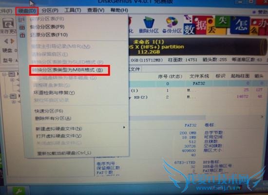 8.然后单击该界面菜单栏中的“硬盘”,选择“转换分区表类型为MBR格式”,会弹出一个界面,点击确定,如图: