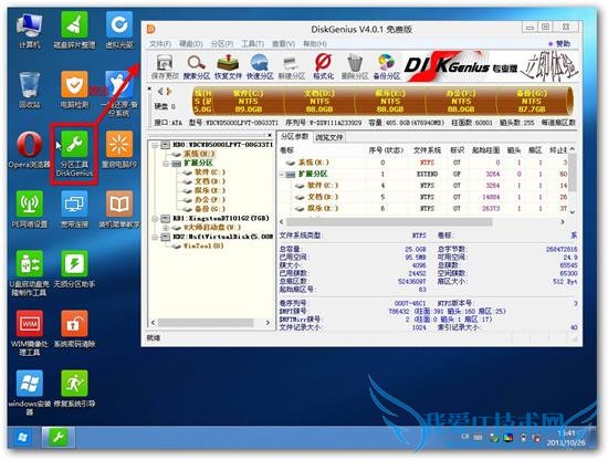 5.进到PE后,双击桌面“分区工具DiskGenius”图标,会弹出一个界面(接下来我们会进行删除所有分区工作,所以在这之前一定要将数据给备份好)如图: